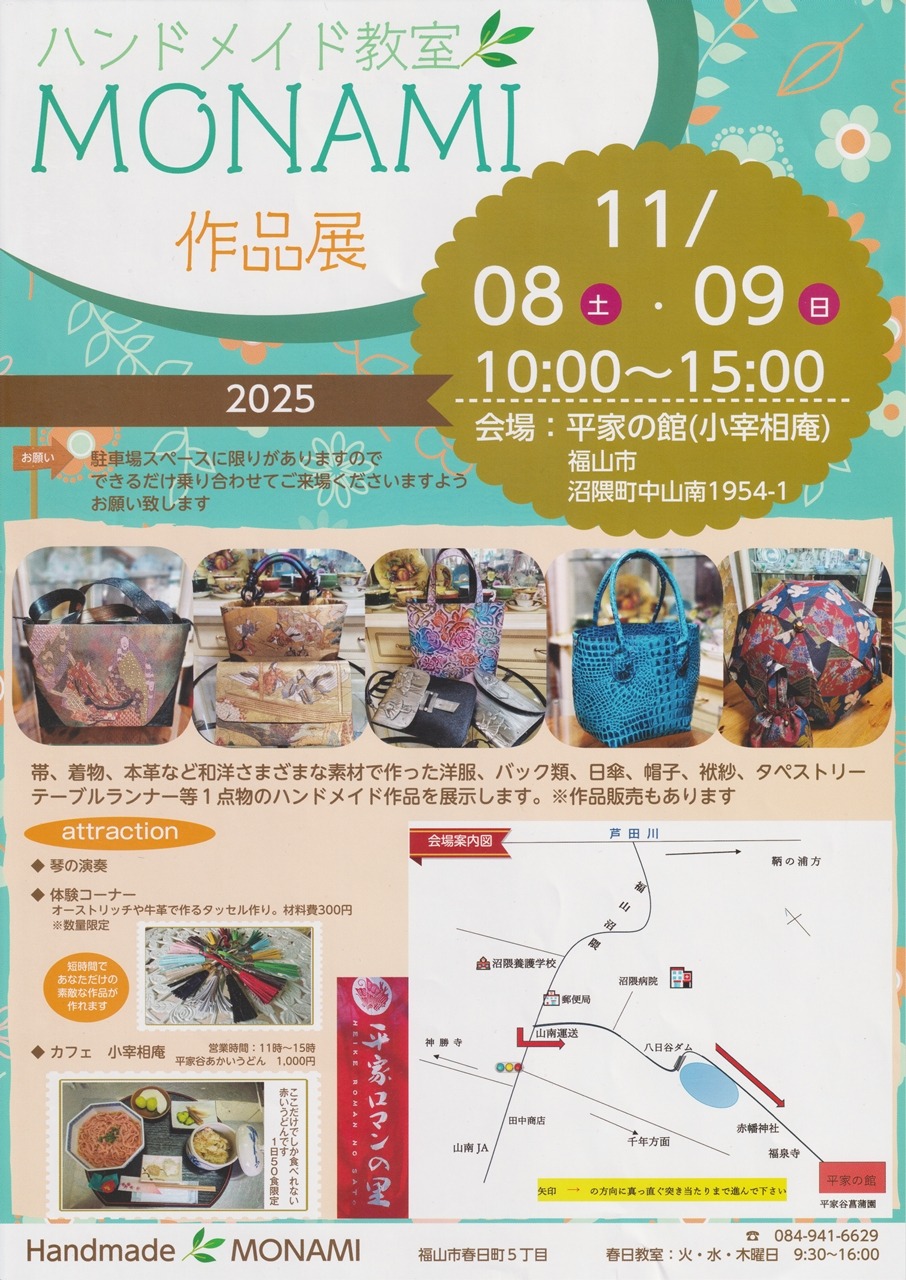 福山市沼隈町の平家の館(小宰相庵)にて、ハンドメイド教室MONAMI作品展が行われます。