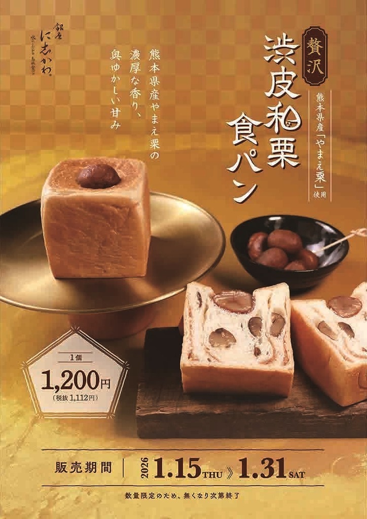 1月15日(木)からは、熊本県産のブランド和栗『やまえ栗』を贅沢に使用した豊かな風味と香りに包まれる『贅沢 渋皮和栗食パン』が販売されます。