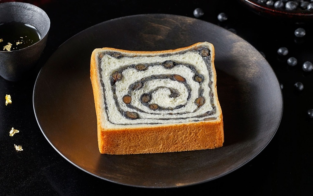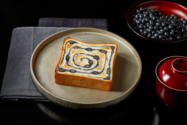 北海道産のふっくら黒豆と白あんに炭を練り込み、しっとりやわらかい銀座に志かわさんの食パンで包まれた上品で奥ゆかしい甘みが特徴的な『招福 黒豆食パン』。