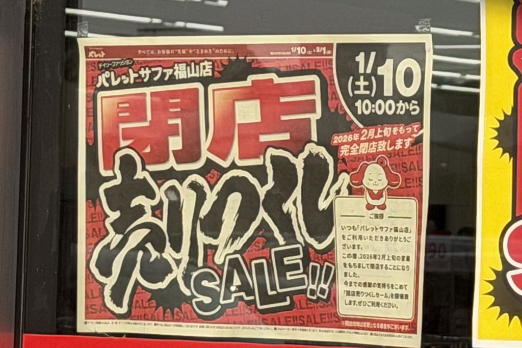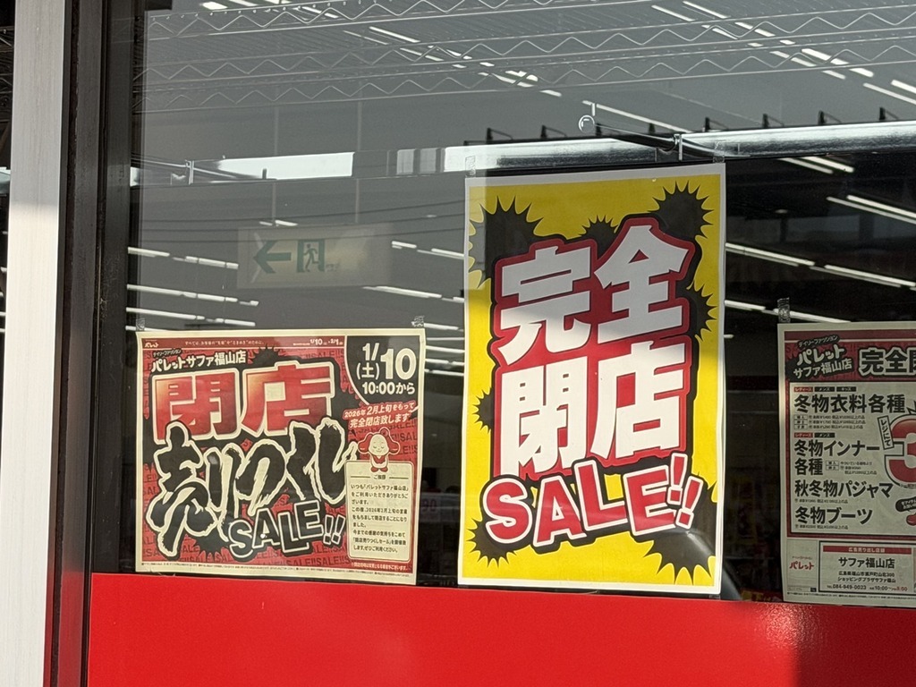 福山市瀬戸町にあるサファ福山内で営業されているディスカウント衣料店『パレット サファ福山店』さんが、閉店されます。