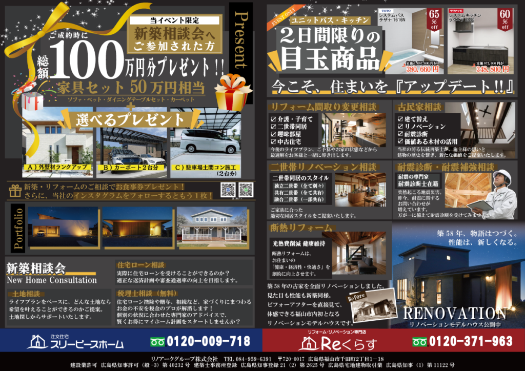 リノアークグループは、スリーピースホーム(新築)・Reくらす(リフォーム)・福山不動産販売(不動産)を中心としたお住まいや家づくりに関する総合企業。お客様に寄り添った提案と無理のない計画が評判で、地元密着型のならではの細かい心遣いに定評があります。